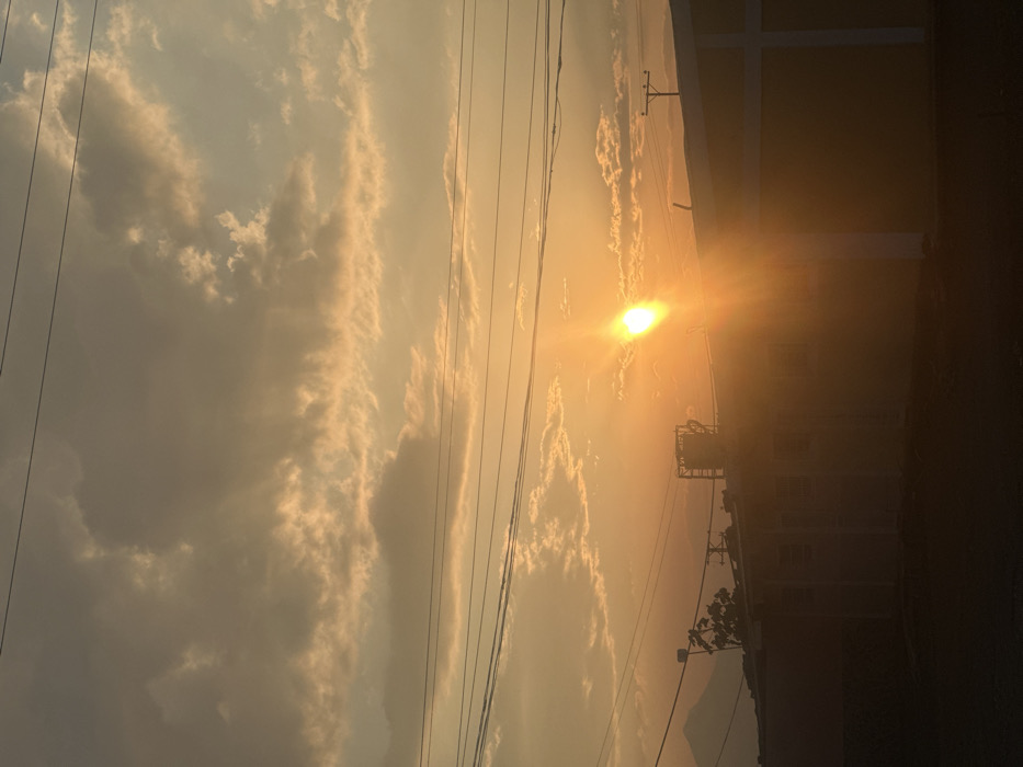The image depicts a sunset over a populated area in Tinaquillo, Venezuela. The sky is largely covered by stratocumulus and altocumulus clouds illuminated from below in shades of orange, gold, and gray. The setting sun, a bright yellow-orange orb, is positioned in the middle-right of the frame, emitting prominent lens flares and casting strong illumination. Multiple dark utility lines traverse horizontally across the upper and middle portions of the sky. In the midground, the dark silhouettes of two low-rise buildings are visible. The structure on the left features discernible window outlines and a prominent, multi-tiered metallic industrial fixture, possibly a water tank or cooling unit, on its roof. The building on the right presents a dark facade with a distinct white vertical architectural element near its corner. A utility pole with crossarms is silhouetted against the sky on the far right. In the far background on the left, a large, dark mountain or hill is visible against the horizon. The immediate foreground is a dark, indistinct surface, likely an unpaved road or ground area. No individuals, vehicles, or specific activities are observable within the frame.