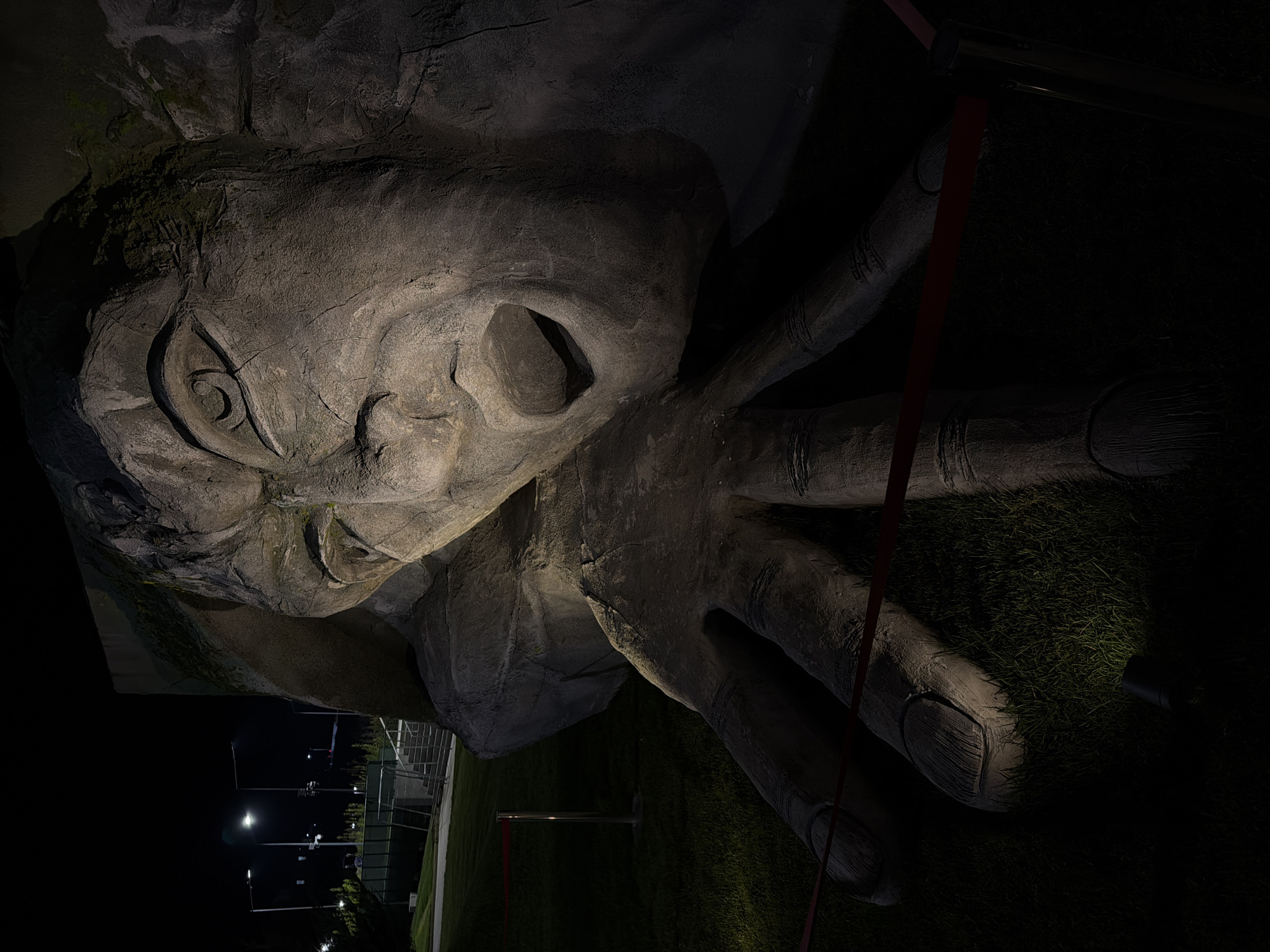 The image depicts the head and hand of a large sculpture, possibly made of stone or concrete, lying on its side on a grassy area. The sculpture has a somewhat cartoonish or fantastical appearance. The sculpture is located in the city of Craiova, Romania. A red rope or barrier is visible near the hand. In the background, there are lights and possibly a building or structure. The scene appears to be at night, with artificial lighting illuminating the sculpture and surrounding area.