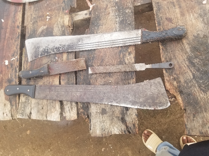 three large knives and a metal file arranged on a wooden surface, likely a table or counter. The knives are all large and appear to be made of metal, with wooden handles. The file is also made of metal, and has a wooden handle. The knives are arranged vertically on the surface, with the file placed between them. The surface is made of rough wood planks that are worn and stained. The environment is likely outdoors. The image does not include any people.