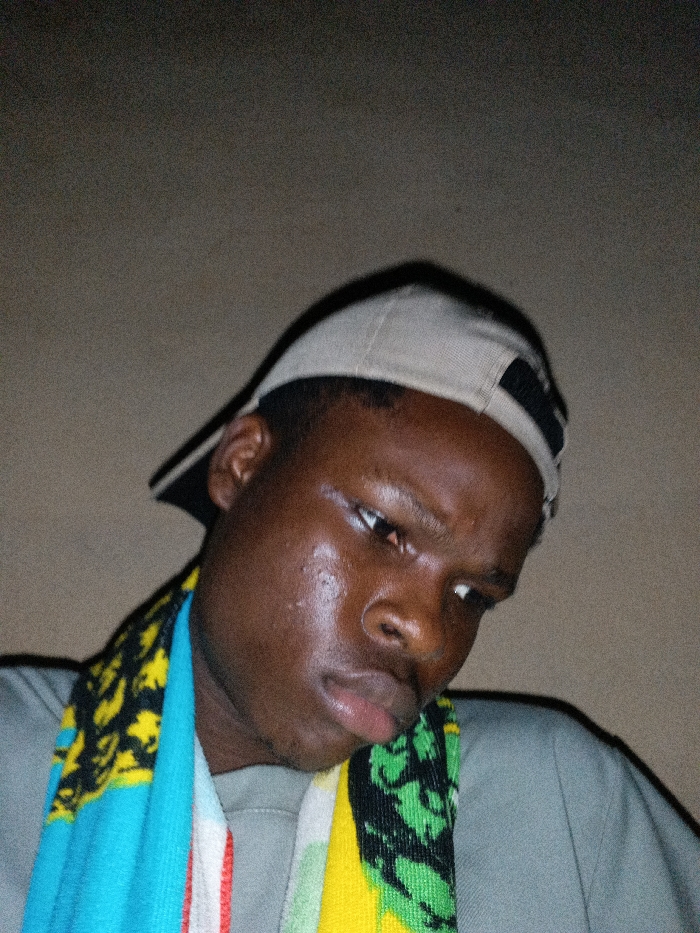 A young man with dark skin, wearing a light-colored baseball cap backwards, is the focus. He has a serious expression, with his eyes glancing to the side. He is wearing a gray shirt and a colorful scarf, featuring a mix of blue, yellow, and black. The background is a simple, neutral tone. The lighting is dim, creating shadows on his face and enhancing the texture of his skin.
