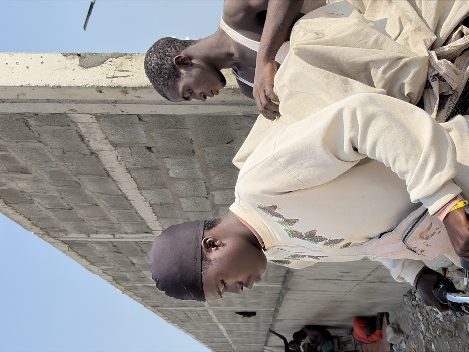 This image captures a daylight street scene in Alaguntan, Nigeria. Two young males are prominent in the foreground and midground, positioned against a tall, grey concrete block wall. The subject in the foreground is a young male with dark skin, wearing a dark blue or black skullcap and a light-colored, long-sleeved sweatshirt with a quarter-zip collar. The sweatshirt features a repeating pattern of dark green and brown pinecone-like motifs. A light pink fanny pack with a visible zipper is strapped across his waist. He holds the handlebars of a bicycle, looking downwards and slightly to his left. A yellow wristband is visible on his right wrist. Directly behind him, to his right, is another young male with dark skin, wearing a white sleeveless tank top. He looks towards his right, with his hands positioned over a large, light-colored, crinkled fabric bundle or sack that appears to be loaded on the bicycle. Part of a woven white sack with text, possibly "REFINED GRAM OF SUGAR," is visible beneath this bundle. The interaction suggests the second male is either adjusting or securing the load on the bicycle. The background is dominated by a long, high wall constructed from stacked concrete blocks, interspersed with vertical concrete support columns. The sky above the wall is clear and blue. To the far left, at the base of the wall, several other individuals are partially visible in a cluttered area, with one wearing an orange garment, amidst what appears to be debris and discarded items on the ground. The scene is brightly lit by natural sunlight.