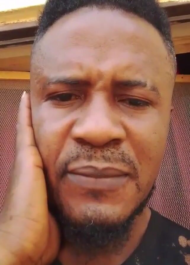 A close-up video shows a dark-skinned man looking downward with a somber expression
