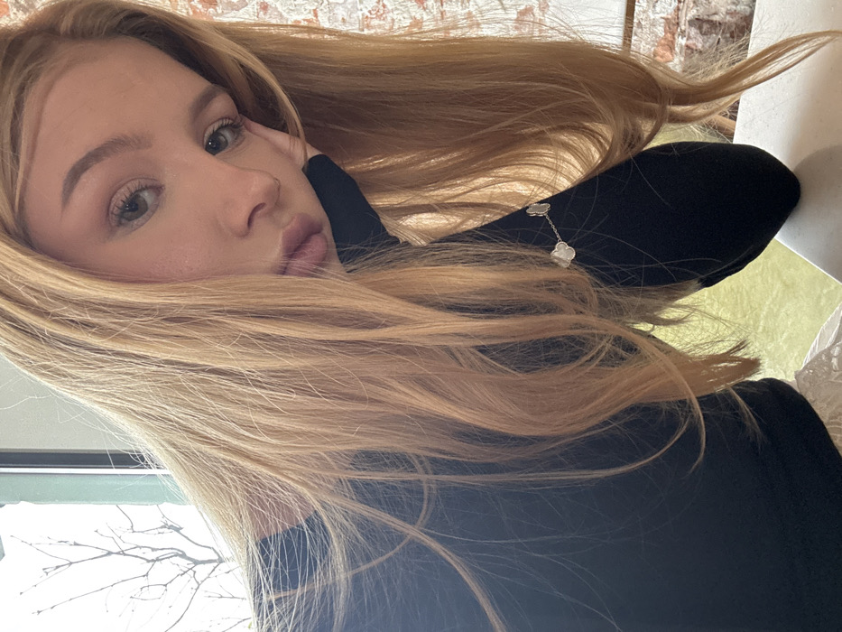A young woman is depicted in a close-up, angled indoor photograph taken in the city of Dnipro, Ukraine. She has light skin, light-colored eyes, and long, straight blonde hair. Her head is tilted, and her gaze is directed towards the camera. Her right hand is positioned against her right cheek, partially obscured by her hair. She wears a dark, long-sleeved garment, possibly black. A silver-colored bracelet adorned with two white, clover-shaped charms is visible on her right forearm, beneath a section of her hair. The background on the left features a window revealing bare tree branches against an overcast sky. To the right, an exposed brick wall is present. A white tabletop surface occupies the lower right portion of the frame, with a diffuse green area visible in the lower left.
