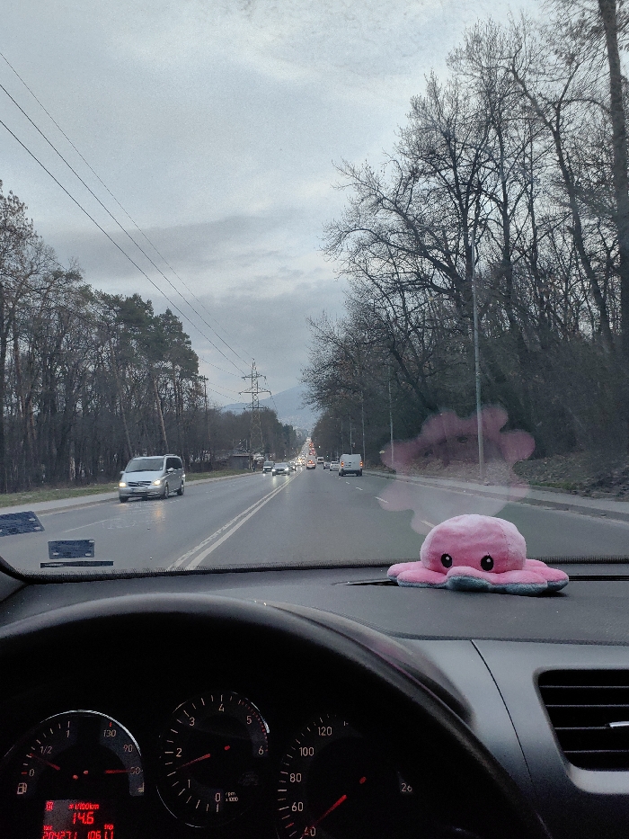 The image depicts a roadside scene from the interior perspective of a vehicle in Sofia, Bulgaria, on an overcast day. In the foreground, the lower section of a dark vehicle dashboard is visible, featuring a steering wheel partially obstructing the view on the bottom left. An instrument cluster to the left shows a speedometer at 0 km/h and a tachometer at 0 RPM, along with a digital display indicating 204,271 km and 10.6 l/100km. A red digital readout shows "14:5". On the central dashboard, a pink plush reversible octopus toy with a light blue underside and black eyes is positioned, with its reflection visible on the windshield above it. Beyond the windshield, a multi-lane asphalt road extends into the distance, appearing wet or damp, reflecting ambient light. The road features a solid white line and a dashed white line separating lanes of travel in the same direction. Oncoming traffic is visible, with several vehicles displaying illuminated headlights. A silver Mercedes-Benz Sprinter van is prominently positioned in the opposing left lane. The road is flanked on both sides by dense groves of trees, predominantly bare deciduous trees, suggesting late autumn or winter. Some evergreen conifers are interspersed within the tree line on the left. Overhead, multiple power lines stretch across the scene, supported by a prominent, lattice-structured power pylon visible on the left side of the road in the mid-distance. Another utility pole is visible on the right. In the background, a large mountain range, identifiable as Vitosha Mountain, rises, partially obscured by a hazy, overcast sky. The overall lighting suggests a dull day or late afternoon/early evening. The location is identifiable as a major thoroughfare in Sofia, likely **Bulevard Cherni Vrah** (Cherni Vrah Boulevard), in a section approaching or within the vicinity of the Sofia Ring Road, with the view generally looking towards Vitosha Mountain.