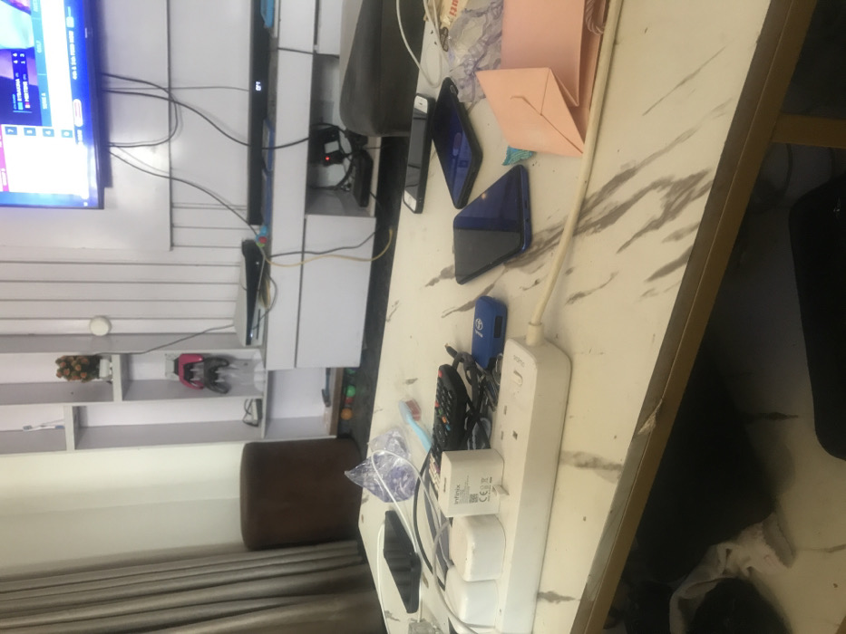 The image displays a cluttered indoor living space, identified as a residential area in Akure, Nigeria. The foreground is dominated by a rectangular table featuring a white surface with gray marble-like veining. On the table, from left to right, are a black smartphone, a white six-outlet surge protector with a white "Infinix" brand USB wall charger and a second charger plugged in. A light-colored cable extends from the surge protector to the right. Adjacent items include a black remote control, a small blue USB device, a clear plastic bag containing indistinct contents, a light blue toothbrush, and a set of keys with a black keychain. Further right are three smartphones, two with dark blue screens, and two flattened light pink paper gift bags. A long, thin, light-colored rod or cable lies on the table's surface. In the mid-ground, a white media console with shelving and drawers supports a black soundbar positioned beneath a wall-mounted flat-screen television. The television displays a colorful graphic interface with text and numerical data. A white Sony PlayStation 5 console rests horizontally on the left section of the media console. Multiple black, white, and yellow cables are visible, connecting various electronic devices. A red indicator light is visible within a lower compartment of the media console. To the left of the television, a wall section features vertical white and light purple striped panels and shelves. A decorative potted plant with orange-brown flowers is on one shelf, and below it, two red and black gaming controllers are hung on a bracket. Small, colorful balls (green, red, orange) are visible on the floor beneath the media console. On the far left, light-colored curtains are drawn across a window, and a brown, cylindrical ottoman or stool is positioned. No individuals are present in the scene.