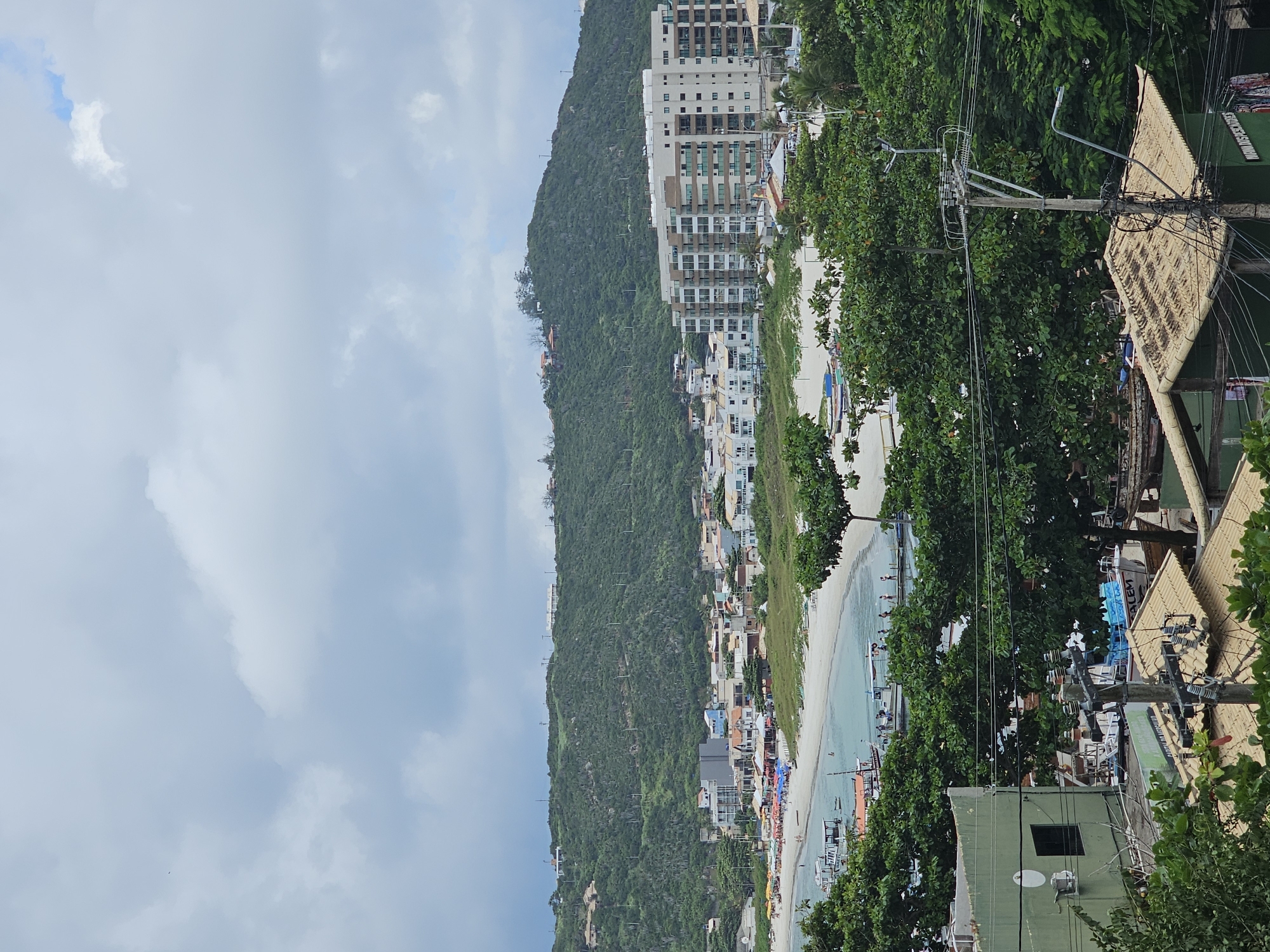 An elevated long shot captures a coastal scene in Arraial do Cabo, Brazil, under an overcast sky. The foreground features a utility pole with multiple electrical wires and insulators, positioned above the tiled roofs of several low-rise structures and obscured by dense green tree foliage. To the lower left, a portion of a two-story green building with a dark rectangular window and a circular white emblem is visible. The midground reveals a light blue-green bay with a curved, sandy white beach. Multiple small boats, some with orange hulls, are anchored or moving in the calm water. A pier extends into the bay, with several individuals visible on its structure and in the shallow water near the shore. The beach itself shows numerous colorful beach umbrellas (red, orange, blue, green) and scattered beachgoers, indicating active recreational use. Behind the beach area, a cluster of residential and commercial buildings forms a coastal town. These structures vary in size and architectural style, including a prominent multi-story building with a beige facade and numerous balconies on the right side of the bay. Roads or pathways are visible between these buildings and the beach. The background is dominated by a large, verdant hill covered in dense green vegetation and scattered with several small buildings and houses along its slopes and crest. The sky above is entirely covered with diffuse grey and white clouds. A small dark speck, potentially an avian subject, is visible in the upper left portion of the sky.