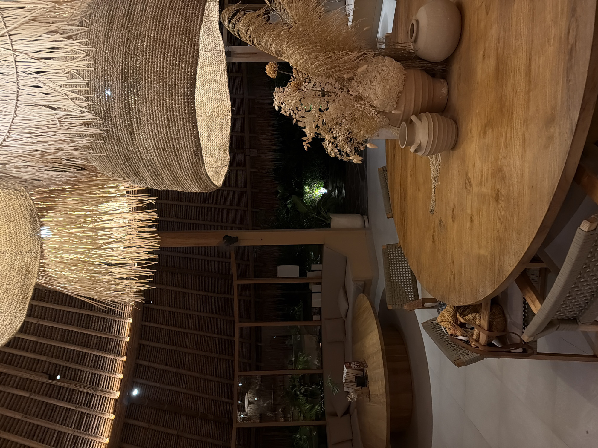 The scene depicts a dimly lit, unoccupied interior space with a natural, tropical aesthetic, located in an unknown city, Indonesia. In the foreground, a large, light-brown circular wooden table occupies the lower right quadrant. Centered on this table is an arrangement of dried botanical elements, including pampas grass, dried leaves, and flowers, displayed in a collection of light-colored ceramic vessels of varying sizes and shapes. Several chairs with woven rattan seats and backs, and wooden frames, are positioned around this table. One such chair, in the lower left, has a woven natural fiber bag with a brown leather strap resting on its seat. The midground features a curved seating area consisting of a continuous upholstered bench, light beige in color, which follows the curvature of an interior wall. In front of this bench, an elliptical light-brown wooden coffee table is visible. On this coffee table, a small potted green plant, a stack of books (one titled "SPA RTY" visible), and other indistinct items are present. The overhead structure features a high, conical ceiling constructed from natural, light-colored woven fibers, supported by dark wooden beams. Recessed spotlights are visible within the ceiling structure, providing ambient illumination. The back wall of the interior space consists of large, multi-paneled glass windows that reveal a dark exterior environment. The outdoor area is characterized by lush tropical foliage, sparsely illuminated by concealed light sources, and features a visible stone pathway in the distance. The flooring throughout the interior is light-colored and uniform. No individuals are present.