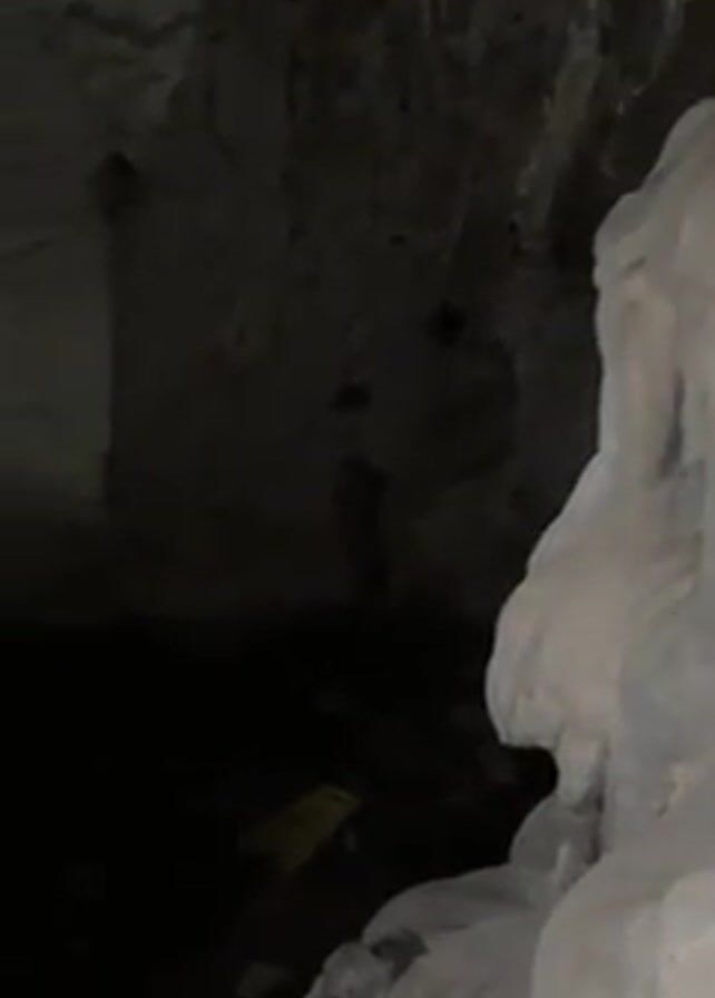inside of a cave. In the foreground, there is a large, irregularly shaped white rock formation, possibly a stalagmite. Behind the rock formation, the cave floor appears to be covered in dark water, with a yellow object partially visible in the water. The cave walls are textured and uneven, with dark spots and crevices. Lighting is dim, with some shadows and highlights accentuating the texture of the rocks.