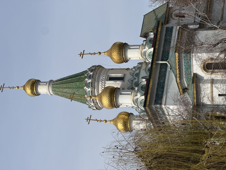 The image depicts the upper portion of the Church of St. Nicholas the Wonderworker, commonly known as the Russian Church, located on Tsar Osvoboditel Boulevard in Sofia, Bulgaria. The church features a prominent central spire with a green conical tiled roof, topped by a golden onion dome and an Orthodox cross. Flanking the main spire are four smaller golden onion domes, each also topped with an Orthodox cross. The church walls are predominantly white, adorned with intricate teal, green, and gold friezes and decorative elements, particularly visible beneath the domes and rooflines. The sky above is a clear, light blue. In the foreground, partially obscuring the lower and left sections of the church, are numerous bare, deciduous tree branches, some with visible catkins or small buds, indicating a late winter or early spring environment. No people, discernible actions, or interactions are visible within the frame.