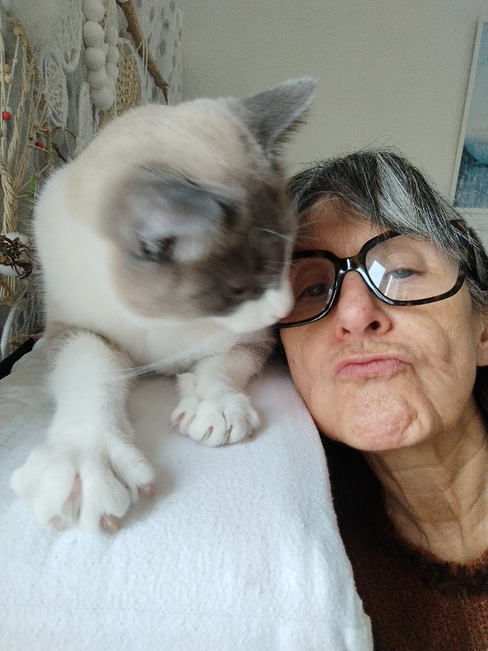 The scene depicts an adult individual and a domestic cat in an indoor setting in Montélimar, France. An individual, identifiable as an adult female with short, dark grey hair, occupies the right side of the frame. She wears large, dark-rimmed eyeglasses and has her lips pursed, creating wrinkles around her mouth and chin. Her right eye is clearly visible, while her left is partially obscured by the cat. She wears a brown, textured garment. A cat, exhibiting Siamese-like color points with a light body and darker face and ears, is positioned on the left, resting on a white, textured fabric, possibly a blanket or towel, draped over the individual's left shoulder area. The cat's head is turned downwards and slightly to the right, appearing out of focus, suggesting slight movement or shallow depth of field. Its front paws, displaying visible claws, are placed on the white fabric. The background, largely out of focus, reveals decorative elements on a light-colored wall to the left, including woven textiles, white spherical objects, and branches adorned with red berries. The environment appears to be a well-lit, domestic interior.