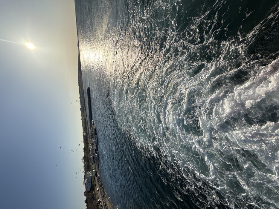 - "The image captures a detailed view from the stern of a moving vessel, looking towards the port of Kamariotissa, Greece, under a clear, bright sky" by FM-GvERo2, licensed under CC BY 4.0