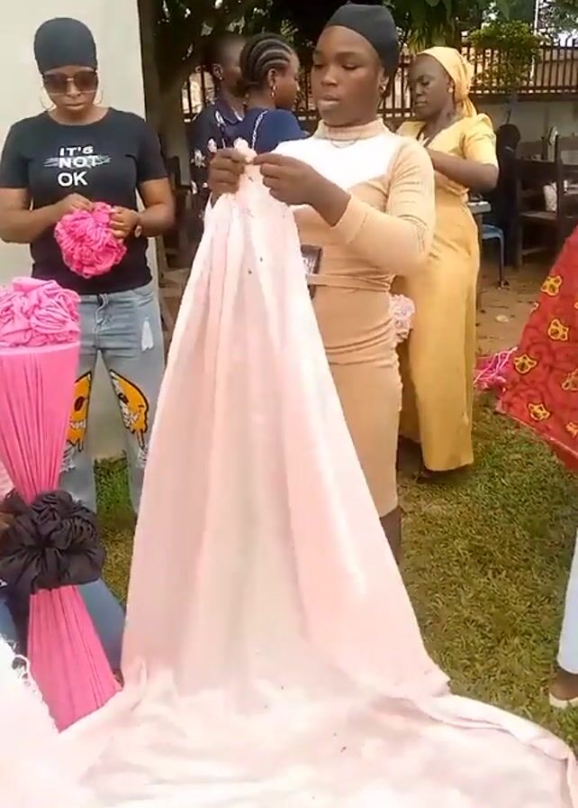 Several women are gathered outdoors on a grassy area. The central figure, a young woman wearing a beige dress and head covering, is carefully examining a long, light pink gown. She appears to be adjusting or inspecting the fabric. To her left, another woman wearing sunglasses and a black t-shirt with "IT'S OK" printed on it holds a pink fabric flower. She stands near a small table draped with pink and black fabric. In the background, several other women are present, some of whom are talking amongst themselves. The setting suggests an event or gathering, possibly related to a wedding or celebration where clothing and decorations are being prepared. The environment is bright and sunny.