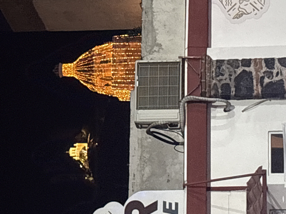 A rotated image showing a building with a dome illuminated by lights at night. An air conditioning unit is affixed to the side of the building. The building's facade is a mix of textures, including stone and white paint. A portion of a sign with the letters "RE" is visible at the bottom. Another building with lights is seen in the background.