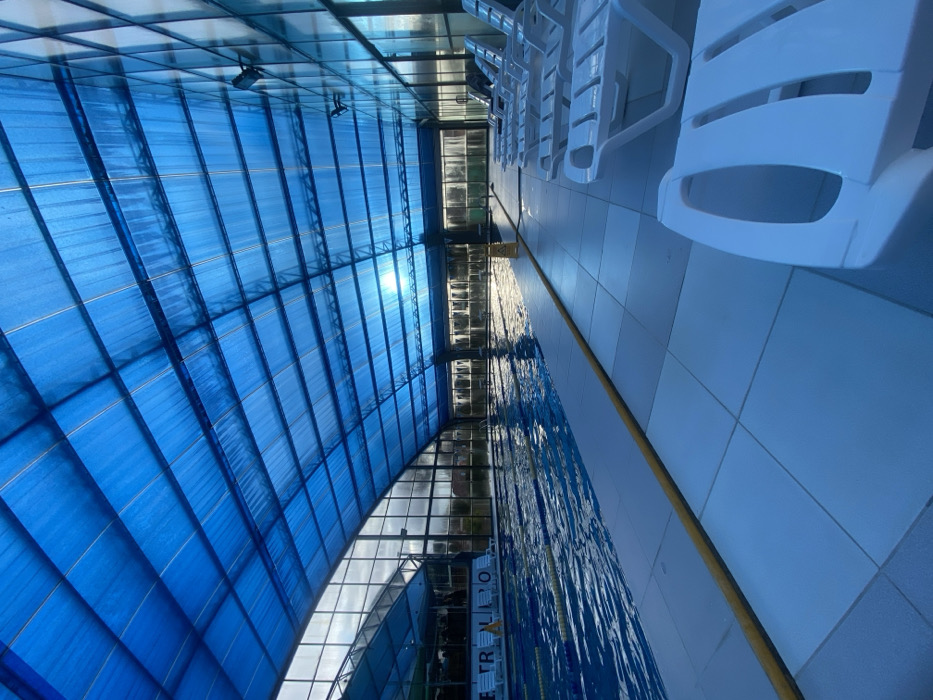 - "A swimming pool is depicted under a blue, paneled ceiling, likely indoor" by FM-33abC2, licensed under CC BY 4.0