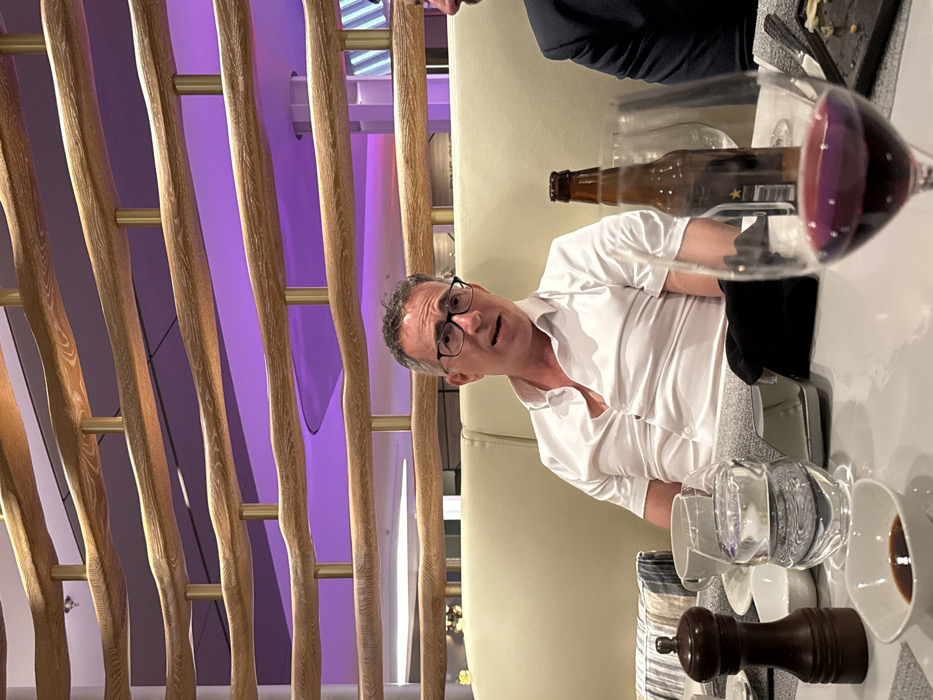 An indoor dining scene features two individuals seated at a white table in what appears to be a contemporary restaurant or lounge in Rum Cay, Bahamas. The central figure is a male, estimated to be in his 50s or 60s, with short, curly grey hair and black-framed eyeglasses. He is wearing a white short-sleeved collared shirt, with the top buttons unfastened, and is seated in a light beige upholstered booth. He faces forward, looking towards the camera, with his mouth slightly ajar, suggesting he is speaking or about to speak. To his immediate right, a second individual's left shoulder and a portion of their dark blue or black suit jacket are visible, indicating another person is seated at the table. The white tabletop is populated with various dining items: a dark wooden pepper mill, a small white rectangular dish containing a dark liquid (possibly soy sauce), a striped blue and white cloth napkin, a white ceramic cup, a clear glass filled with water, and a smaller white bowl. Towards the right, a metallic-silver-colored clutch or purse rests next to a folded black napkin. A brown glass beer bottle, bearing a white label (partially obscured, but the brand "Sapporo" is faintly discernible), stands upright. In the immediate foreground, a wine glass filled with red wine occupies the right side of the frame, slightly out of focus. A plate with minimal food residue is also visible on the far right. The background consists of a decorative architectural element: a partition or wall feature composed of multiple horizontal, undulating wooden planks or branches, supported by vertical brass-colored rods. Behind this structure, a smooth, curved surface is illuminated with a consistent purple ambient light, suggesting a modern interior design.