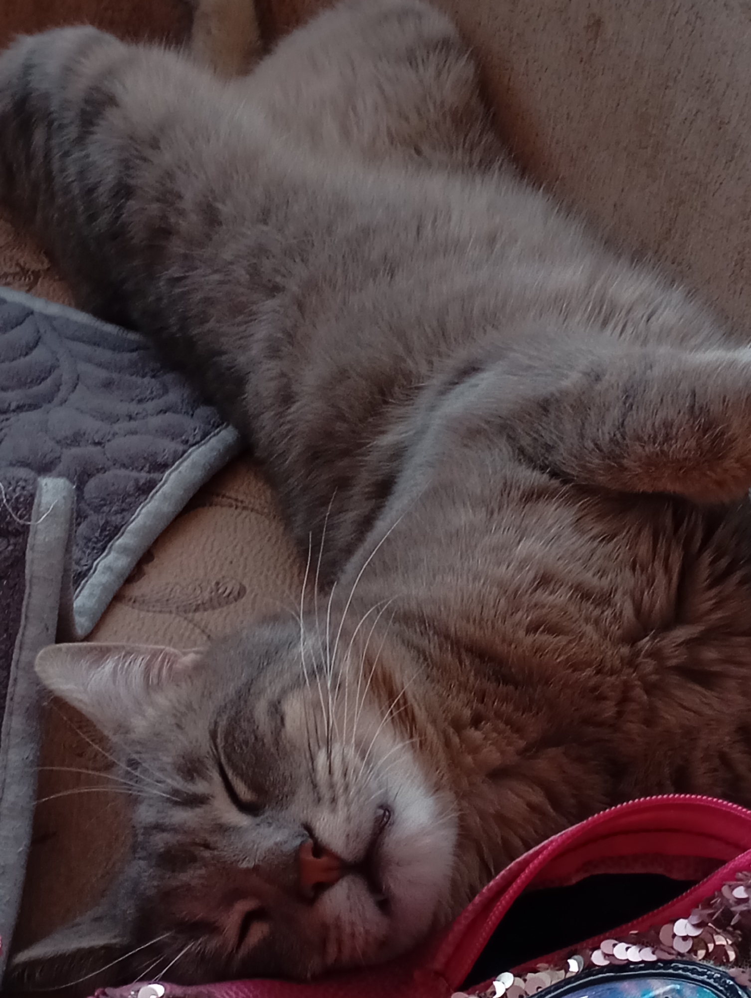 The image displays a domestic cat sleeping on its back, positioned in an indoor setting. The cat, exhibiting a gray-brown tabby coat, lies supine with its eyes closed and its head tilted towards the lower right of the frame, revealing its pink nose and white whiskers. Its front paws are curled near its chest. The cat is resting on a light brown, textured surface, likely upholstery or a blanket. To the left of the cat, a dark gray quilted mat or blanket with a repetitive pattern is visible. In the bottom right corner, a pink sequined pouch or bag with an open zipper, revealing a dark interior lining, is partially visible. No human subjects are present. The location, Kurganinsk, Russia, is provided by the user.