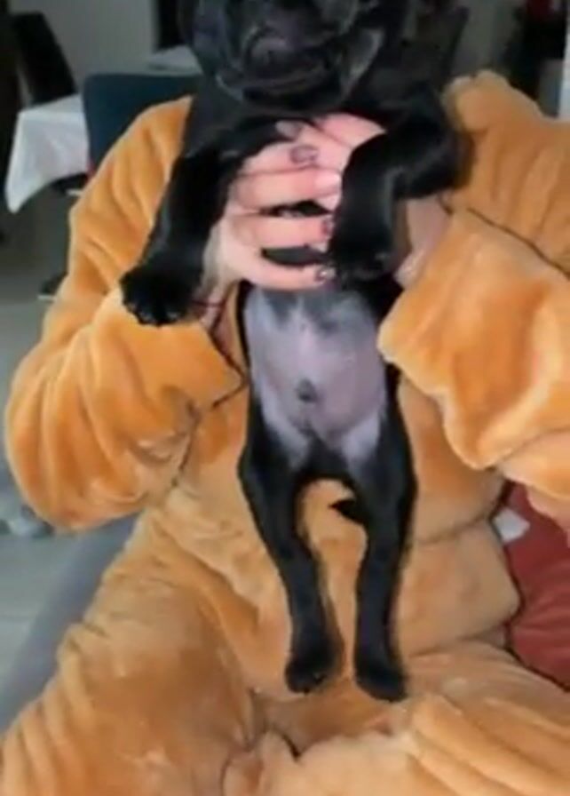 A person wearing a tan plush onesie is sitting and holding up a black pug puppy