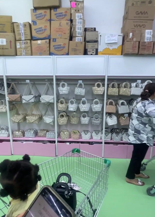 n indoor retail environment, possibly a warehouse or discount store, with shelves filled with sparkly handbags. A woman in a patterned shirt and black pants pushes a shopping cart down an aisle. A person holding a smartphone stands near a smaller shopping cart, seemingly comparing items on the phone screen with the handbags on display. A child is partially visible near the smaller cart. Cardboard boxes are stacked above the shelves, labeled with text like "WHITENING SHOWER GEL" and "GAVIA BODY SPRAY & AFRICA." The floor is green.