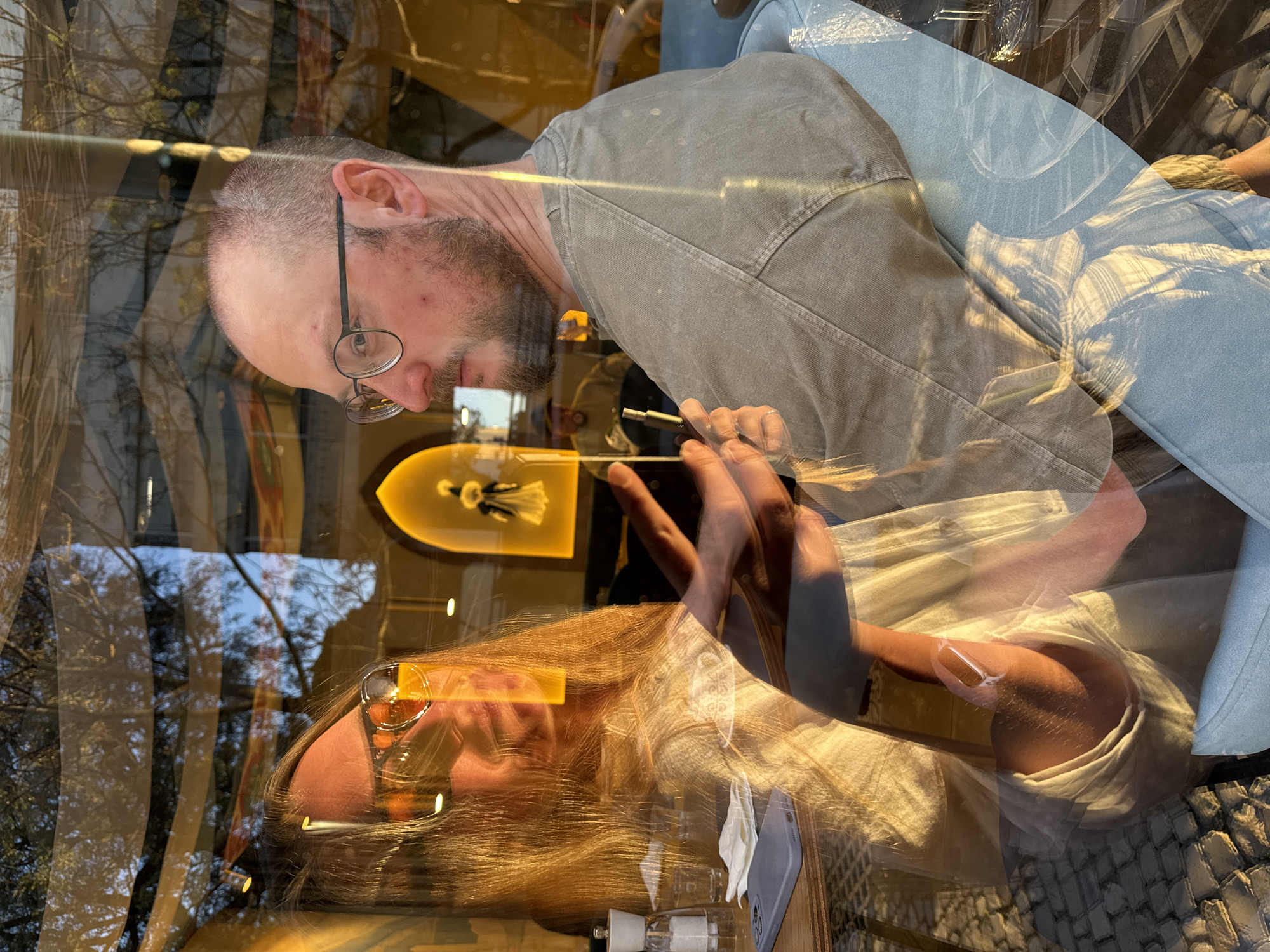 A reflection of two individuals is visible in a window. The primary subject is a fair-skinned man with short, thinning brown hair and a beard, wearing glasses and a khaki-colored shirt. He appears to be holding a metallic tool or instrument, possibly working on something out of frame. Superimposed over his image is the reflection of a woman with long, blonde hair and glasses. Her face is visible, and she is situated near a table or surface with additional objects, including a phone and condiments. Behind the reflections, the blurred cityscape is visible, possibly including trees and buildings, characteristic of urban environments. The location is likely Lisbon, Portugal, based on the architectural style and cobblestone pavement seen in the reflections.