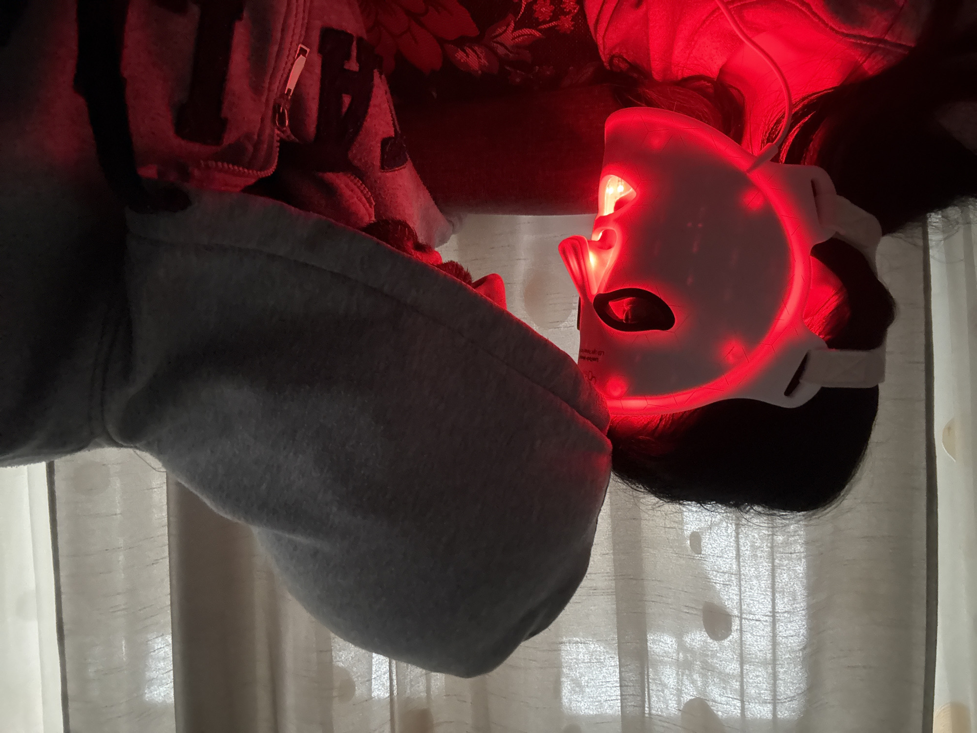 - "A person lies on their back wearing a red light therapy face mask" by FM-GxyCn2, licensed under CC BY 4.0