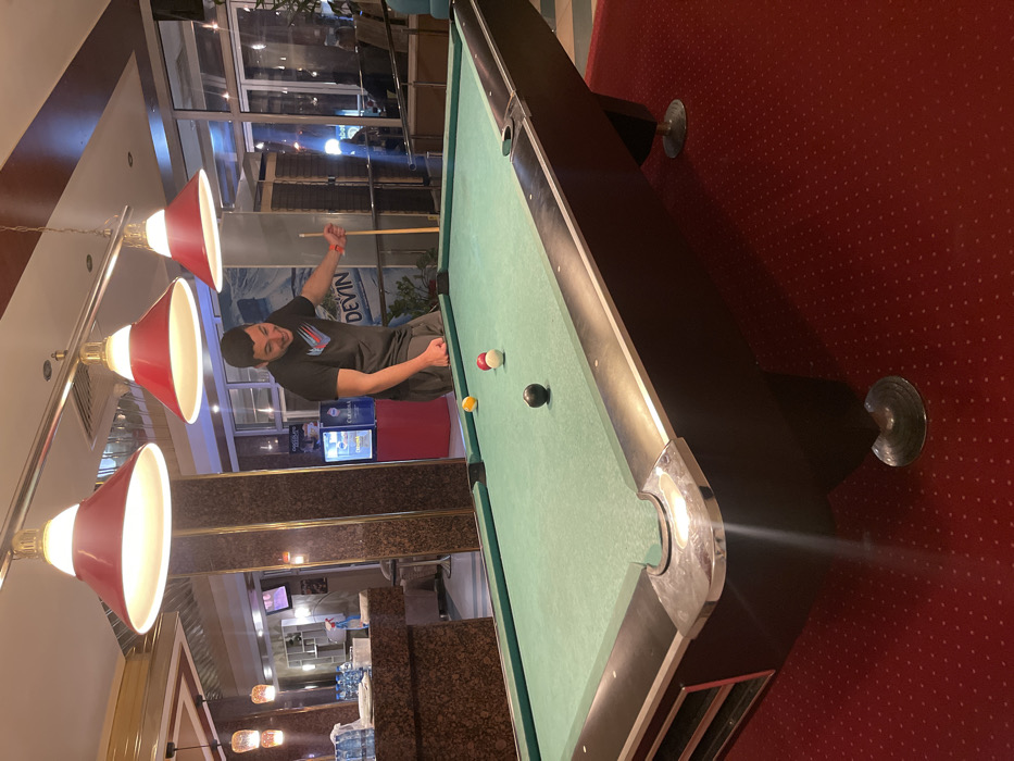 An indoor scene depicts a recreational area within a commercial establishment, potentially a hotel lounge or bar, in Veliko Tarnovo, Bulgaria