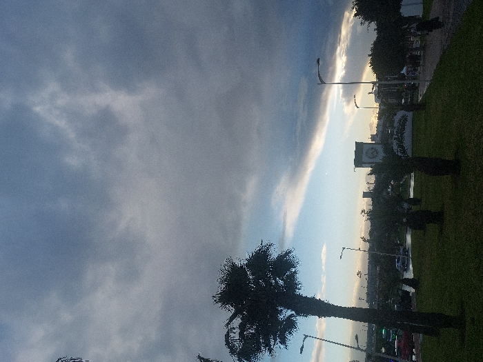 The image displays an urban park or plaza scene in Salé, Morocco, identifiable by the distinct Salé Clock Tower visible in the background. The upper two-thirds of the frame are filled with a heavily overcast sky, characterized by dense, dark grey and bluish-grey clouds. A horizontal band of lighter, clearer sky, featuring soft blues and hints of white clouds, is visible towards the horizon in the center-left. In the foreground, a neatly maintained lawn occupies the lower portion of the image. Several palm trees are scattered across this grassy area; a tall, slender palm tree stands prominently on the far left, partially cropped. Shorter, thicker palm trunks are visible closer to the center. The grass surface appears damp. In the midground, a paved pathway runs along the right side of the lawn, where several indistinct human figures are visible, walking or standing. Beyond the lawn and pathway, a multi-lane road or intersection is present, populated by vehicles including cars and a green-lit bus on the left, some exhibiting illuminated lights. Multiple streetlights with dark poles and fixtures extend upwards from the midground. In the background, the distinctive Salé Clock Tower, a large, rectangular building with a prominent white clock face, is visible centrally. Further urban structures are faintly silhouetted against the distant horizon. The overall lighting is dim, indicative of dusk or heavily overcast conditions, resulting in diffused shadows and silhouetted elements.