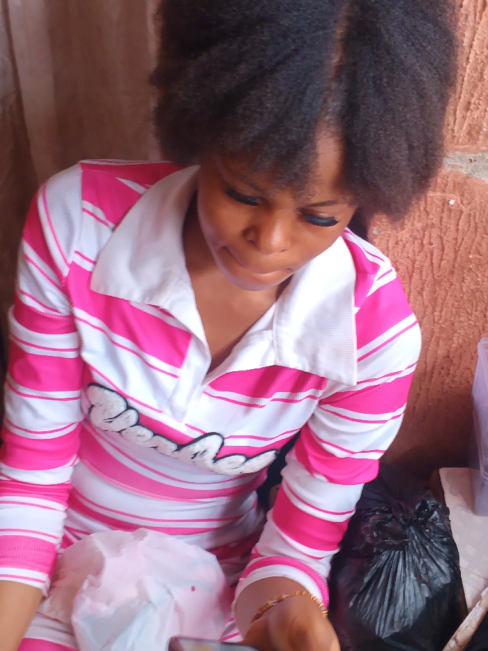 The image depicts a single individual, likely female, situated in an indoor or semi-enclosed setting in Orifite, Nigeria. The individual has dark skin and black, textured hair parted in the middle. She is wearing a long-sleeved, collared shirt with alternating horizontal pink and white stripes. A white embroidered text, partially obscured, is visible on the chest area. Her head is tilted downwards, with her gaze directed towards an unseen point below the frame. Visible eyelash extensions are present. Her right arm is positioned forward, adorned with a thin, light-colored beaded bracelet. Her right hand holds a small, rectangular object, partially out of frame at the bottom, possibly a smartphone. A crumpled white plastic bag containing a light-colored substance with a faint reddish stain is positioned in front of her left side. To her right, a black plastic bag, tied shut, rests next to a translucent purple container. The background consists of a reddish-brown, textured wall on the right and a lighter brown, smooth surface, possibly a curtain, on the left.