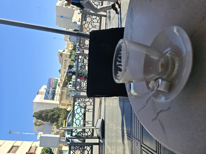 The image presents an outdoor cafe view in Meknes, Morocco, captured from a low angle