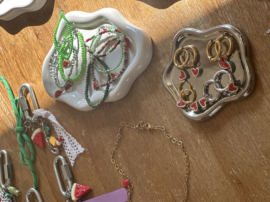 The image displays an overhead view of jewelry and accessories arranged on a light brown wooden surface, illuminated by direct lighting. In the upper left, multiple keychains are visible, each consisting of a silver-colored carabiner clip, green cord, and attached charms, including red and green watermelon slices, a yellow rectangular piece, and a white lace strip. A white, irregularly shaped ceramic tray occupies the middle right, holding several beaded bracelets or necklaces in green, earthy tones, and multi-colored patterns, many featuring small red and green watermelon slice charms. Directly below, a reflective silver-colored, irregularly shaped tray contains an assortment of gold- and silver-toned hoop earrings, accompanied by numerous loose red and green watermelon slice charms. A gold-colored chain, likely a necklace, with an oval link design and a lobster clasp, lies partially on the wooden surface in the lower left, featuring a small red charm near one end. The scene is located in the city of Paris, France.