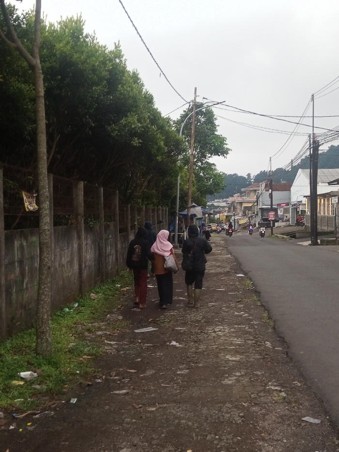 The image depicts an outdoor street scene under an overcast sky, located in Karimnagar, India. Three individuals are observed from behind, walking away from the viewer on an unpaved, uneven dirt path on the left side of the frame. The path features scattered debris and light vegetation. To the immediate left of the path, a concrete wall topped with a metal fence section runs parallel, behind which a dense line of tall green foliage forms a barrier. The first individual from the left wears a dark hooded garment and red-brown trousers. The second individual, positioned centrally, wears a light pink hijab, a light brown top, dark lower garments, and carries a light-colored shoulder bag. The third individual, closer to the road, wears a dark hooded garment, dark shorts or trousers, and dark boots, while carrying a dark backpack. To the right of the path is an asphalt road, appearing damp. Multiple utility poles with numerous tangled overhead power lines are visible along the road. Further down the street on the right, various commercial and residential buildings with light-colored facades are visible. Several motorcycles are present on the road in the mid-ground, some appearing stationary, others potentially in motion. Hilly terrain with vegetation is discernible in the distant background.
