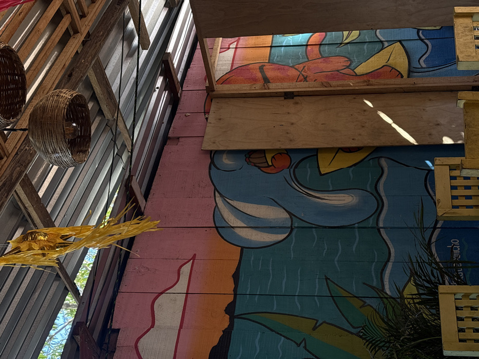 An angled perspective shows a building's interior and exterior. The interior features a wooden frame structure with hanging woven baskets and yellow streamers. Outside, a colorful mural is painted on wooden boards, depicting a blue and orange figure. A plain wooden plank is situated above the mural, and part of a wooden lattice structure is visible on the right. The mural displays whimsical cartoon-like art.