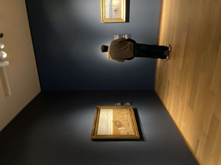 man standing in a gallery room. He is wearing a brown sweater and blue jeans, looking at a painting that is hanging on the wall to his right. The painting is a landscape scene and has a golden frame. The man has a woman standing to his left who is partially obscured. The gallery has blue walls, a white ceiling with recessed lighting, and a wood floor. There are two other paintings hanging on the wall opposite the man. The gallery appears to be located in Greenwich, Connecticut, United States. The room is dimly lit. The man is the only person visible in the image. The environment is serene and quiet. The lighting is soft and even. The overall impression is one of contemplation and quiet appreciation for art.