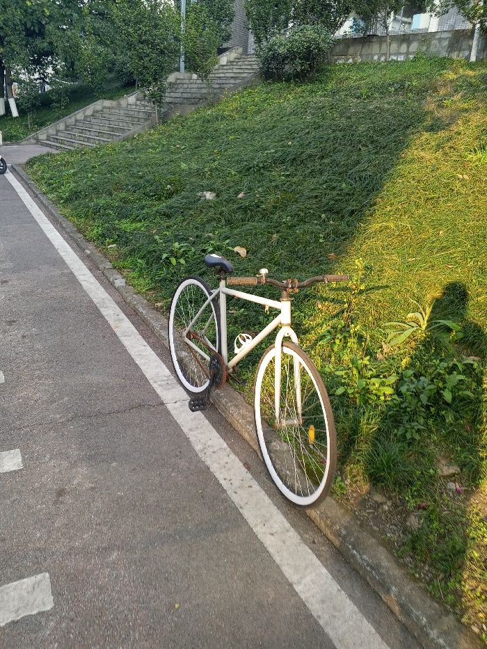The scene is located in Jiangjin, China. An outdoor view shows a light-colored bicycle leaning against a concrete curb separating an asphalt path from a vegetated incline. The bicycle has a light grey or white frame, white rims, black tires, a black seat, and visible rust on its chain and handlebars. A water bottle cage is affixed to the frame, and a small yellow reflector is on the front wheel spokes. The asphalt path features a continuous white line along the curb and fragmented white lines further left. The incline is covered primarily with dark green ground cover and some taller green plants. Concrete stairs ascend the slope in the background, surrounded by trees and bushes. Portions of light-colored structures are visible through the background foliage. Sunlight illuminates the right side of the grassy slope, where a distinct human-shaped shadow is cast. No individuals are present in the frame.