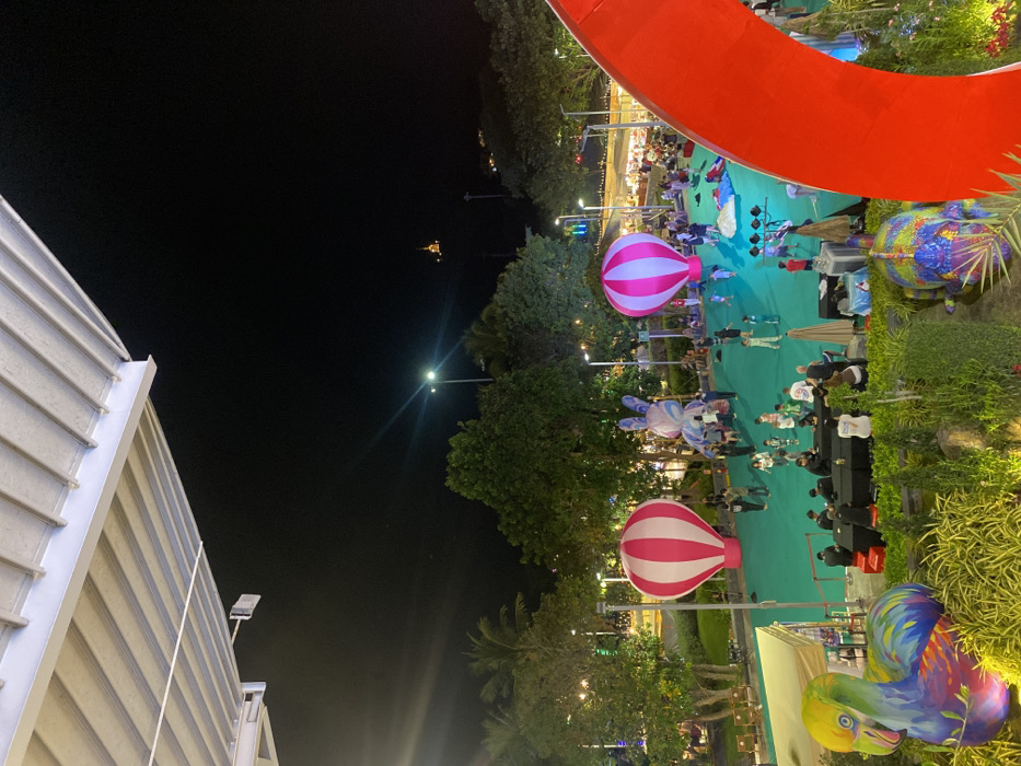 An elevated view captures a lively outdoor night scene in Baan Chaweng, Thailand, with the illuminated golden Big Buddha (Wat Phra Yai) visible on a distant hill against a dark sky. The foreground is occupied by a large, vibrantly painted Dodo bird sculpture with blue, green, yellow, and red hues, positioned amidst green foliage. To the right, a large red, curved architectural element partially frames the scene. The central area features a wide expanse covered with green turf, populated by numerous individuals of varying ages, including children. Two large, inflatable hot air balloon replicas, striped pink and white, stand vertically on the left and right sides of this green space. A significant blue and pink inflatable rabbit sculpture is centrally located towards the left. A section with multiple black tables and chairs, under a white tent canopy, is visible near the bottom of the green area, where several people are seated. Beyond the immediate event space, a bustling market area with numerous lights and stalls is evident, with trees and streetlights interspersed. Overhead, a corrugated white roof structure extends from the top left corner. People are observed walking, standing, and interacting throughout the event area, contributing to a festive atmosphere.