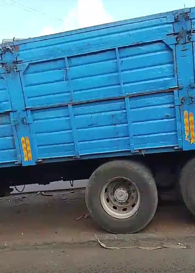 The video begins with a close-up of the rear of a blue truck with a slatted bed. The camera then moves to show the entire truck from a roadside angle. Subsequently, the vantage point shifts to the interior of a vehicle, looking out through the window. In the background, there's an accident scene involving another truck and some debris scattered on the road. A man is seen running across the road.