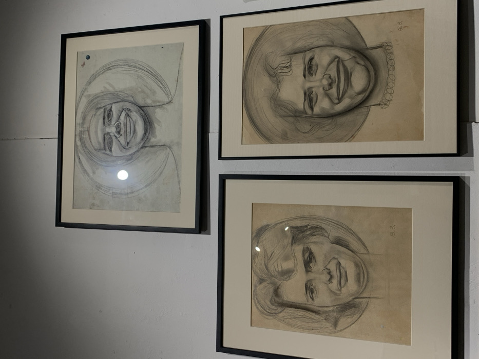 Three framed drawings hang on a white wall. Each depicts a sketched face. The top left drawing features a symmetrical face with circular lines forming the head shape. The top right shows a face with a hat and a necklace. The bottom drawing is a rotated face with soft hair. All have a simple, raw aesthetic.
