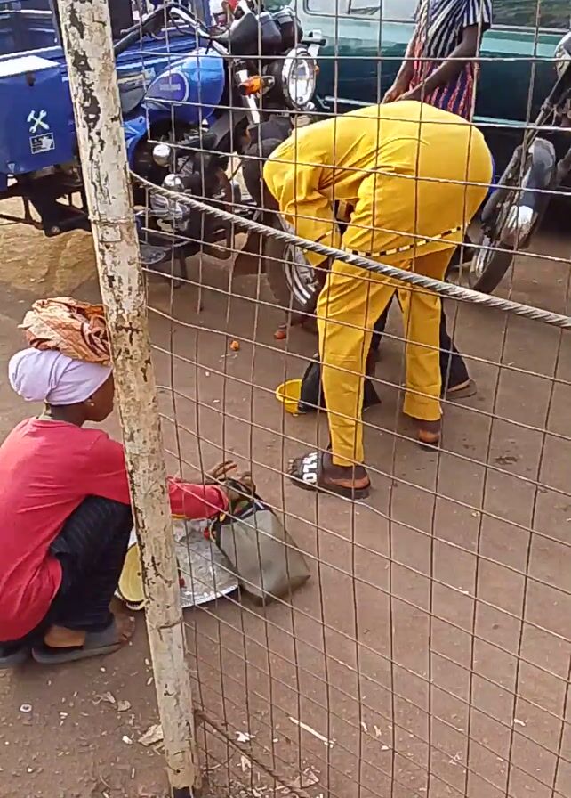 A street scene displays a woman in a pink shirt and dark pants squatting next to a wire fence with a tray of colorful food for sale. Several people are gathered on the other side of the fence; one in a yellow suit appears to be making a purchase. A blue utility vehicle and a green car are parked nearby. The scene is bustling with potential transactions as people interact with the street vendor.
