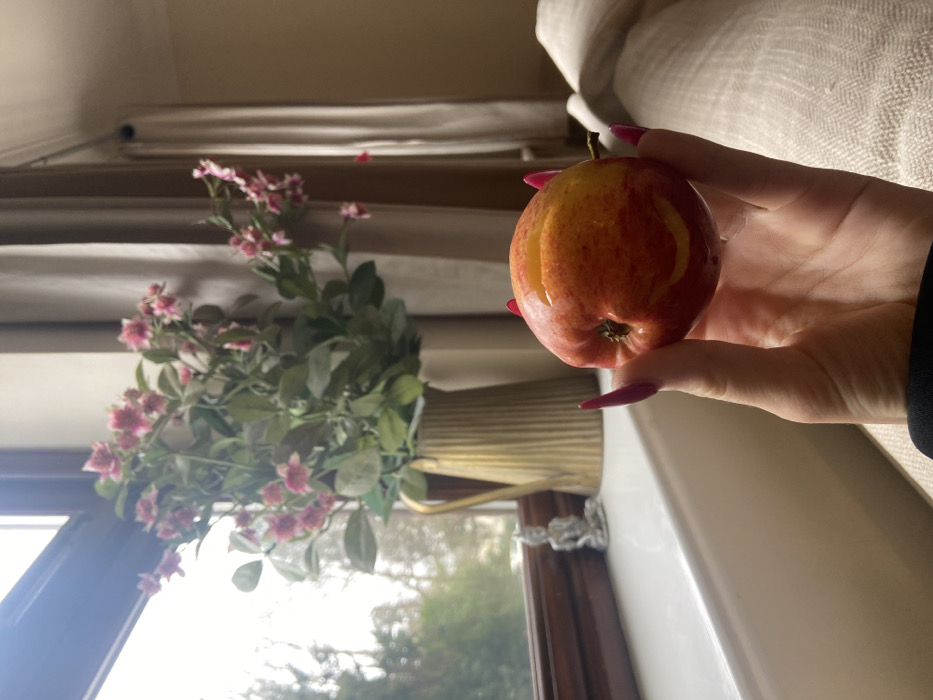 A close-up image displays a human hand holding a red and yellow apple, with two shallow horizontal cuts forming eyes and an inverted U-shaped cut forming a mouth, creating a rudimentary smiley face. A small liquid droplet is visible on the apple's upper surface. The hand features long, pointed fingernails painted a dark pink or magenta color. The scene is an interior room in the city of Reigate and Banstead, United Kingdom, positioned near a window with a dark brown frame and white sill. On the windowsill, a small silver-colored statuette of a meditating figure is present to the left, and a gold-colored, ribbed pitcher containing artificial pink-blossomed flowers with green leaves is centered. Light beige curtains hang to the right of the window, and a portion of light-colored upholstered furniture is visible in the lower right background. The outdoor view through the window shows blurred green trees against a bright, overcast sky.
