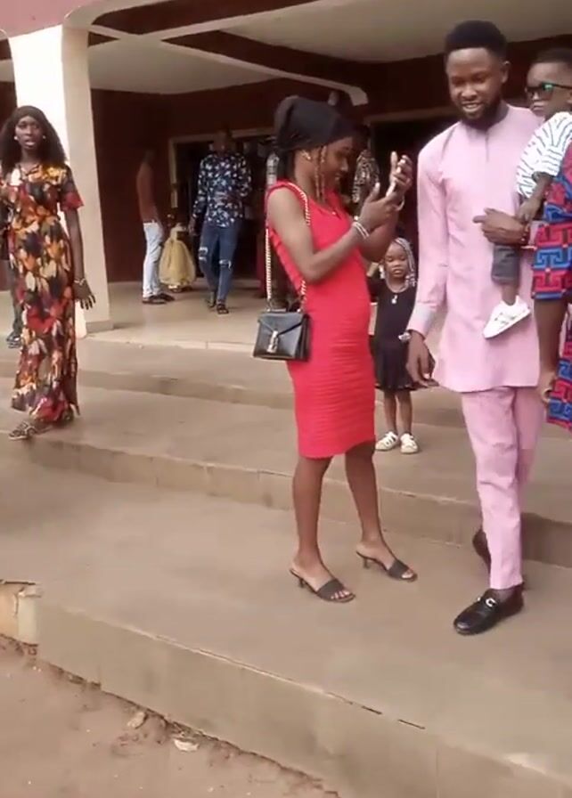 group of people, many dressed in colorful and stylish clothing, gathering outside a building. The building has a brick-like facade and a covered entrance with steps. People are seen taking photos with their phones. A man in a pink suit holds a young child. Another man in a patterned outfit walks by. A woman in a red dress poses for a picture. Several other people are visible in the background, some standing on the steps of the building and others walking around. The ground is mostly dirt, with some grassy areas. The overall atmosphere appears lively and celebratory.