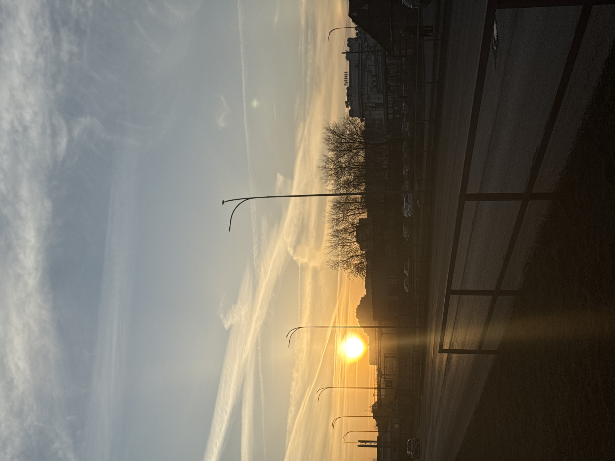 The image depicts a sunset in Bol'shie Mkhi, Russia. The sun is positioned near the horizon, casting a golden glow on the surroundings. Numerous contrails are visible in the sky, intersecting and creating a pattern against the blue and orange hues. A row of streetlights lines the road, their poles extending into the sky. Bare trees are silhouetted against the bright sunlight, with buildings visible in the background. Cars are parked along the road, and the road surface reflects the golden light of the setting sun. A fence runs along the right side of the image.