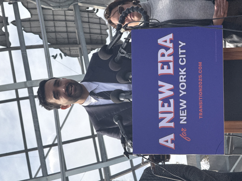 An outdoor political event is depicted in Flushing Meadows-Corona Park, Queens, New York City, evidenced by the Unisphere's metallic grid and landmass structures visible in the background under a partly cloudy sky. In the center, a dark-haired man with a beard, wearing a dark suit, white collared shirt, and striped tie, stands behind a wooden podium, speaking into several black microphones. He is mid-sentence, looking slightly to his right. The podium features a blue sign displaying "A NEW ERA" in large white and red-shadowed letters, "for" in red script, and "NEW YORK CITY" in white. Below this, "TRANSITION2025.COM" is printed in red, with "PAID FOR BY ZEDEKIAH MANN FOR TRANSITION" in small text at the bottom right. To the speaker's right, a woman wearing a grey turtleneck sweater and sunglasses is partially visible from the chest up, observing the speaker. To the speaker's left, a person's shoulder and arm in a grey and black tweed-patterned jacket are partially visible. Two pairs of athletic shoes hang from an overhead wire near the Unisphere structure in the mid-right background.