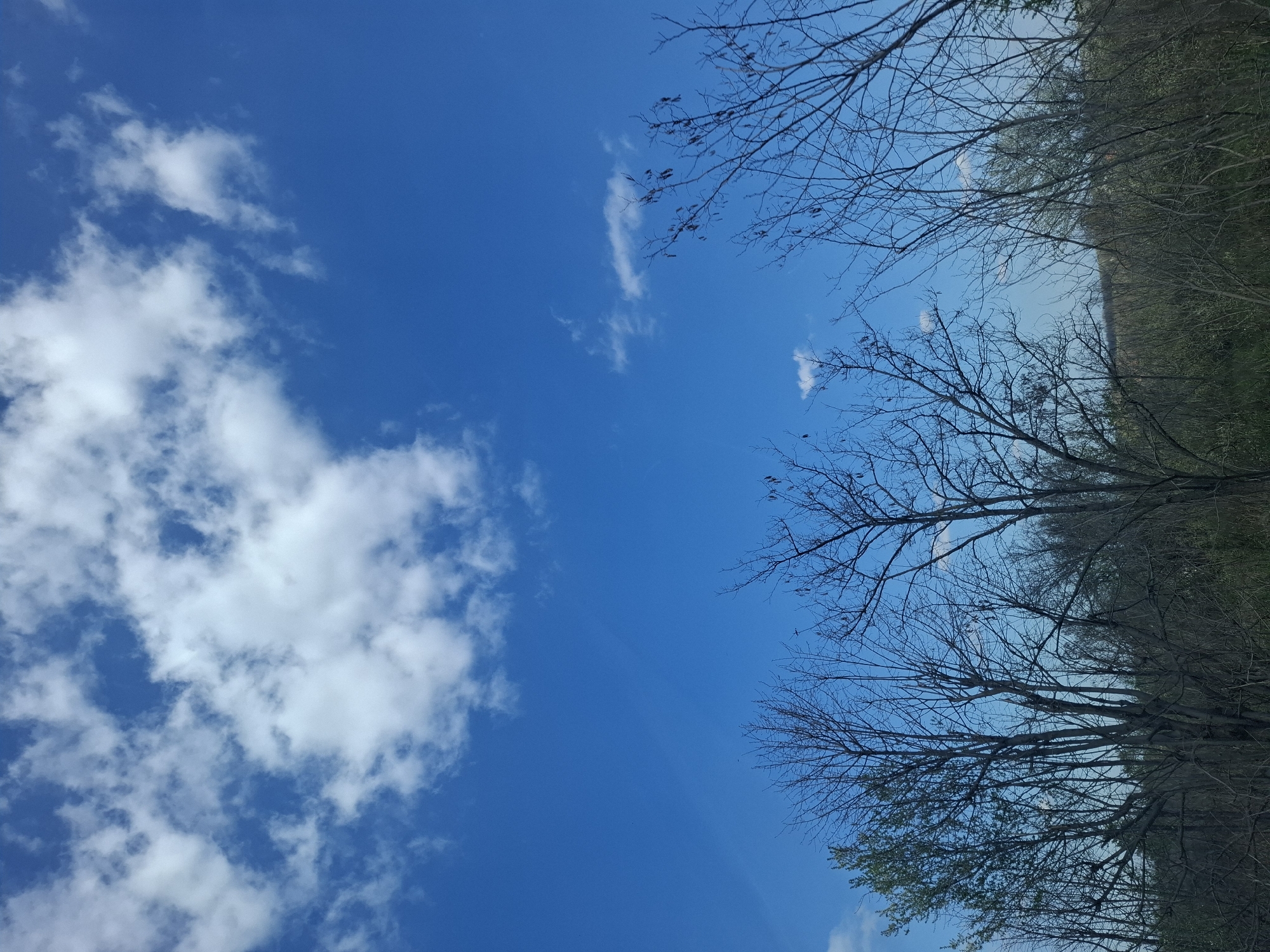bright blue sky with scattered cumulus clouds. In the right side of the image are trees that appear to be in a wooded area or forest. Some trees are bare while some have budding leaves. The location of Topolovets, Bulgaria is not definitively visible, and there is no evidence of human activity or urban features within the frame.