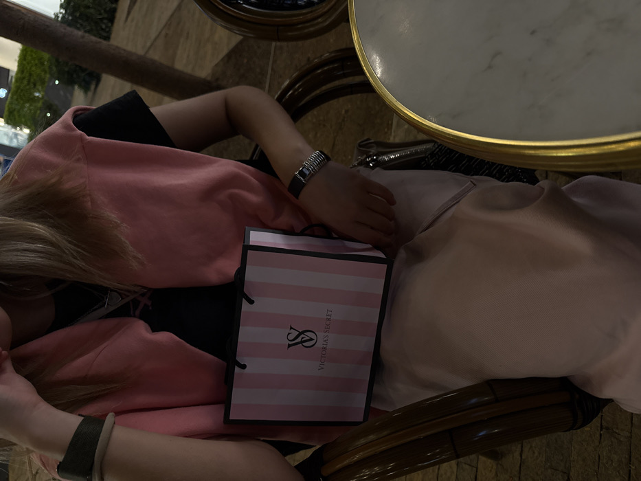 The image depicts an individual, likely female, seated outdoors in the evening or at night within a commercial area, identified as the Antea LifeStyle Center in Santiago de Querétaro, Mexico. The subject wears a black t-shirt, a pink sweater draped over the shoulders, and a light-colored skirt. A small Victoria's Secret paper bag, characterized by pink and white vertical stripes and the brand's logo, is positioned on the subject's lap. The subject's left hand is partially raised towards the face, while the right hand rests on the shopping bag. Visible accessories include a dark band on the left wrist and a silver-toned, segmented bracelet on the right wrist, alongside a small triangular pendant necklace. The subject occupies a dark, possibly rattan, outdoor chair. A partial view of a round table with a white marble-patterned top and a gold-colored rim is visible to the right. The ground consists of light-toned paving stones or tiles. The background is blurred, featuring illuminated trees and indistinct building lights, indicative of an upscale outdoor plaza or mall environment.