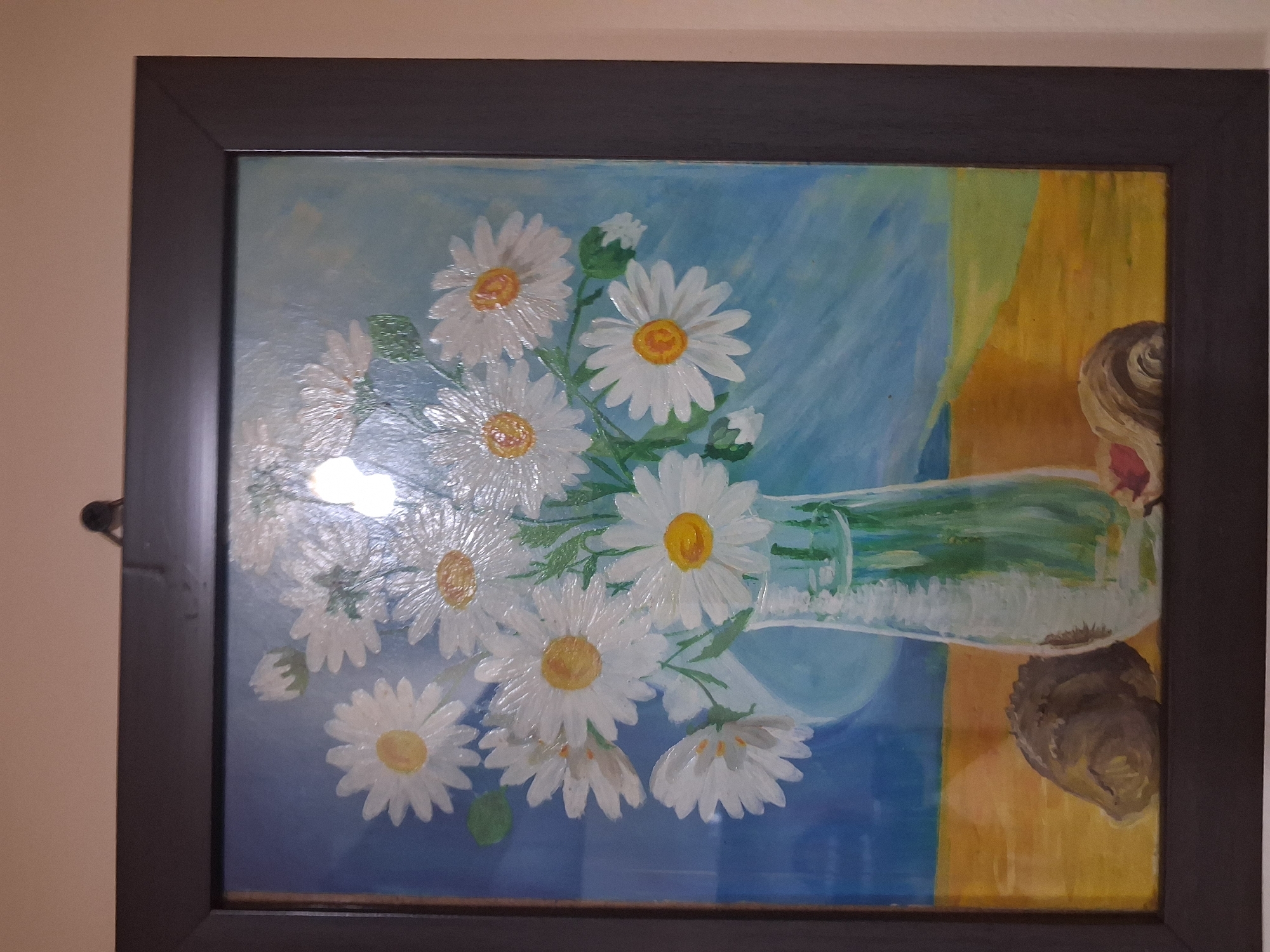 The image displays a framed painting mounted on a light-colored, possibly beige or off-white, interior wall. A small, dark hook is visible at the top center, securing the painting. The frame is rectangular, dark brown or black, with a simple, flat profile. The painting itself is a vertical still life, appearing to be an oil or acrylic work. It depicts a bouquet of approximately fifteen white daisies with yellow-orange centers, arranged in a clear glass vase. The vase contains green stems and is positioned slightly to the right of the painting's vertical center. The background features a gradient of blue hues, transitioning from a darker blue at the top left to a lighter, more sky-blue on the right. The foreground shows a flat surface, rendered in shades of yellow and orange, suggesting a tabletop or shelf. On this surface, to the left of the vase, rests a large, dark brown conch shell. To the right of the vase, a smaller, lighter-colored spiral seashell with a reddish opening is depicted. A prominent, bright, vertical glare mark is present on the painting's surface, particularly visible in the upper central area, suggesting a reflection from an external light source or flash. The precise location within the city of Varna, Bulgaria, cannot be determined from the visual information provided, as the image shows only an interior setting without any identifiable external landmarks or specific architectural features.