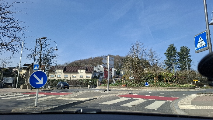 The image captures a road intersection, specifically a roundabout, under a clear blue sky in the city of Sanem, Luxembourg. The perspective is from inside a vehicle, with the top of a dashboard visible at the bottom of the frame. In the immediate foreground, a blue circular traffic sign with a white arrow pointing diagonally down-right is affixed to a pole. A pedestrian crossing, marked by white stripes on a red-painted asphalt section, is visible leading towards the roundabout. The central island of the roundabout is landscaped with various bushes and small trees. To the right of the central island, another small blue circular sign with a white arrow pointing diagonally up-right is partially obscured by vegetation, and a yellow diamond-shaped sign is also visible. On the right side of the frame, a blue square sign indicating a pedestrian crossing is mounted on a pole. In the background, on the left side of the intersection, a dark-colored SUV is positioned near an exit from the roundabout. Further back, residential buildings with light-colored facades and tiled roofs line the street. Behind these structures, a prominent hill covered with bare deciduous trees extends upwards. Streetlights with curved arms are visible throughout the scene. A multi-directional signpost with multiple blank white arrow-shaped signs is located near the center of the intersection. No individuals are present or engaged in specific actions within the depicted scene.