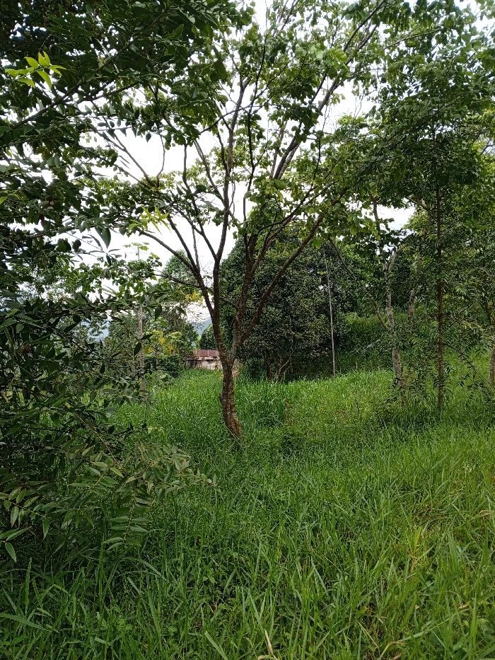 The scene depicts an overgrown, semi-rural landscape consistent with a location like Thotagamuwa, Sri Lanka. The foreground is dominated by dense, tall green grass and scattered low-lying green foliage. In the midground, a prominent deciduous tree with a light brown, gnarled trunk stands centrally, its branches sparsely covered with green leaves. To the right, other trees with darker trunks and fuller green canopies are visible. In the background, partially obscured by dense vegetation, a small, light-colored building with a visible roof and a portion of its wall is present. Further background elements consist of a dense expanse of green trees and hills under an overcast or brightly diffused sky. No individuals, animals, specific human actions, or interactions are discernible. The environment is characterized by natural, uncultivated vegetation.