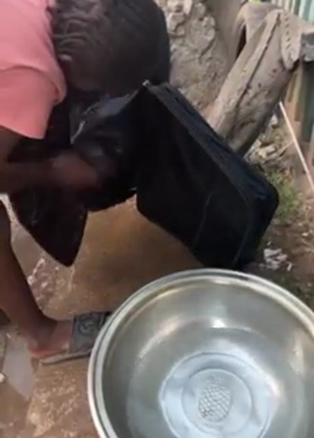 A person in a pink t-shirt is standing outdoors and appears to be inspecting or cleaning the inside of a black suitcase or bag. The person has dark skin and short braided hair. They are standing on a light-colored concrete surface, wearing sandals. To the right of the person is a large metal bowl filled with clear water. Behind the person, there's what seems to be a part of a building or structure, with a rocky texture, and a tire leaning against it. The lighting appears to be natural daylight.