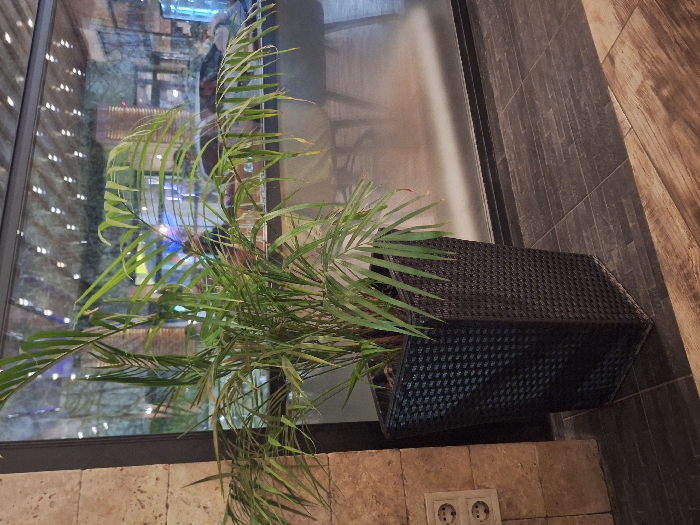 - "An indoor scene in the city of Haskovo, Bulgaria, features a large, green palm-like plant situated within a tall, dark brown, rectangular planter with a woven texture" by FM-FgNiI2, licensed under CC BY 4.0