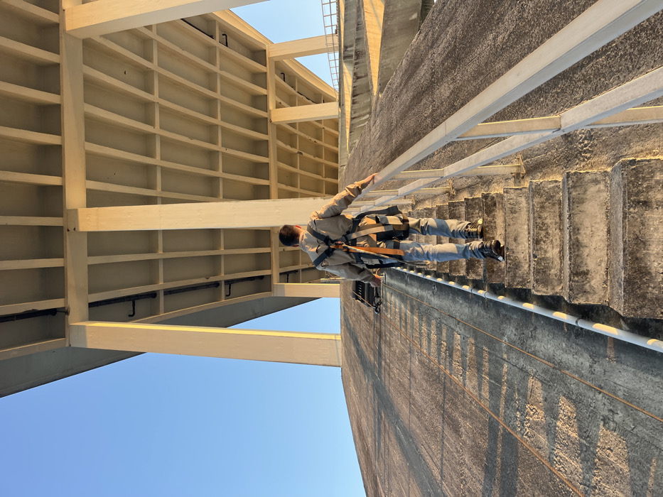 A single male individual is depicted ascending a concrete staircase outdoors, viewed from behind. He wears a light-colored jacket, blue jeans, dark footwear, and a grey backpack. A black and orange full-body safety harness is worn over his clothing. His right hand rests on a light-colored metal handrail that borders the right side of the staircase. To the left of the stairs, a wide, dark grey concrete slope ascends parallel to the stairs, with a thin rope or cable running along its surface. The environment is dominated by a massive, light-colored concrete architectural structure overhead, characterized by numerous vertical support columns and a rectilinear grid of beams forming the underside of an elevated platform. This structure is consistent with the underside of the Ponte da Arrábida (Arrábida Bridge) in Porto, Portugal. The scene is illuminated by warm, low-angle sunlight from the right, creating long shadows and highlighting the concrete, against a clear, bright blue sky.