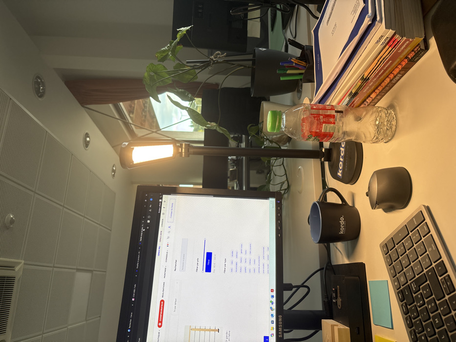 This image captures an organized office desk setup within an open-plan office environment in Lièpvre, France. The foreground displays a black and silver keyboard, a light blue and a yellow sticky note, a black mug with "kordo." branding and a blue interior, and a black computer mouse. Central to the desk is a black Kordo-branded desk lamp, emitting warm yellow light from its vertical rectangular panel. To the lamp's right, a clear plastic water bottle with a green cap and a red-labeled product stands next to a stack of documents, including white papers, blue folders, and several magazines or books with colorful spines. A black pen holder filled with various colored pens is situated behind these items. A black Samsung computer monitor occupies the left side of the frame, displaying a French webpage, likely an e-commerce or product configuration interface, with visible elements such as "Filtrer par prix" (Filter by price) and "Filtrer par type" (Filter by type). Behind the desk lamp, a potted plant with large green leaves is visible in a dark grey pot. The background reveals additional office workstations with monitors and dark chairs, indicating a shared workspace. A large window on the right side of the background shows an exterior view featuring a building structure, green foliage, and an overcast sky, partially obscured by orange-brown curtains. The ceiling of the office features white square acoustic panels, recessed lighting fixtures, and a ventilation grate. No individuals are present in the scene.